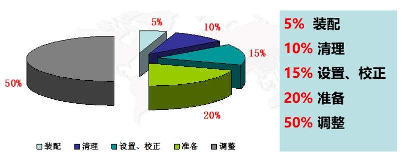 最初使用在汽車(chē)制造廠(chǎng),以達(dá)到快速的模具切換(Exchange of Dies);豐田現(xiàn)場(chǎng)人員經(jīng)過(guò)長(zhǎng)期探索,將沖壓工序沖床模具裝換調(diào)整所需時(shí)間,從1945年至1954年的3小時(shí),縮短為1970年以后的3分鐘,現(xiàn)在,豐田汽車(chē)公司利用設(shè)備快速裝換調(diào)整SMED法,所有大中型設(shè)備的裝換調(diào)整作業(yè)均能在10分鐘之內(nèi)完成。企業(yè)產(chǎn)品切換時(shí)間由4小時(shí)縮短為3分鐘。