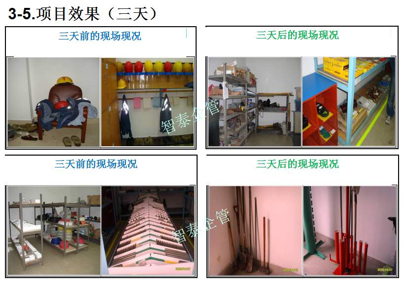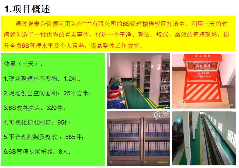 深圳智泰下屬6S咨詢公司在國內(nèi)對(duì)不同行業(yè)推進(jìn)6S管理,98%以上取得非常滿意的效果,智泰專業(yè)團(tuán)隊(duì)三天為企業(yè)打造成功6~8個(gè)標(biāo)桿車間。