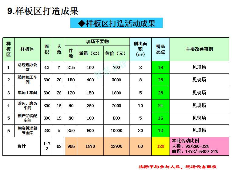 深圳智泰下屬6S咨詢公司在國內(nèi)對不同行業(yè)推進6S管理,98%以上取得非常滿意的效果,智泰專業(yè)團隊三天為企業(yè)打造成功6~8個標(biāo)桿車間,6S咨詢公司快速為企業(yè)達成6S管理目標(biāo)而努力奮斗,企業(yè)要想成為行業(yè)的標(biāo)桿,必須持續(xù)推進現(xiàn)場管理,比如6S或TPM管理等,現(xiàn)場管理好的企業(yè)不一定是標(biāo)桿企業(yè),但標(biāo)桿企業(yè)的現(xiàn)場管理一定是優(yōu)秀的。附件為企業(yè)6S管理推進總結(jié)內(nèi)容,請查閱: