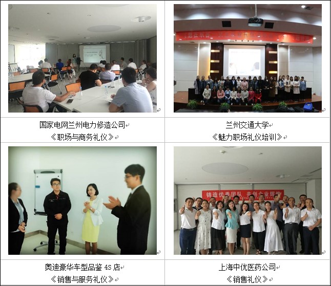 ● 曾為蘭州交通大學(xué),進(jìn)行了16期《職業(yè)素養(yǎng)與禮儀》課程培訓(xùn),并在一年內(nèi)開展了近30場禮儀培訓(xùn)講座,授課人次高達(dá)1000多人。課程內(nèi)容結(jié)合我國禮儀文化與當(dāng)代禮儀現(xiàn)狀,傳授禮儀知識和操作技能,讓學(xué)員真正了解“禮”和“儀”在職場中的關(guān)鍵性作用,促使學(xué)員對自身氣質(zhì)、風(fēng)度、言行舉止有了更高更深的要求……