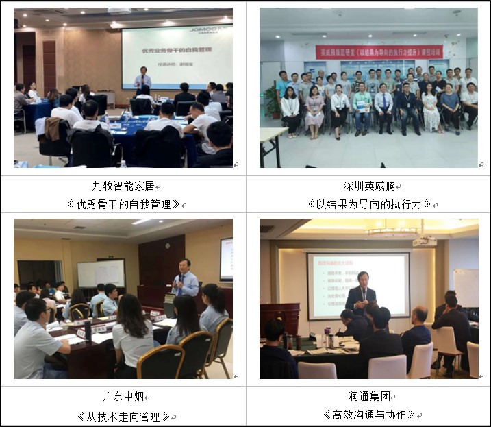 ★為家居建材十大壁紙品牌之一的浙江科翔壁紙講授《管理者核心技能提升》、《高效執(zhí)行力》、《自我管理》、《員工職業(yè)精神》、《高效溝通技巧》等一系列課程,2年時間為該公司各層級員工及經(jīng)銷商先后培訓(xùn)60多場,學(xué)員參訓(xùn)人數(shù)達2000多人次,全面提升了該公司各級人員管理水平及綜合素質(zhì),深受公司及學(xué)員好評。后經(jīng)該公司轉(zhuǎn)介紹,先后為方太廚具、廣州海鷗衛(wèi)浴、福建九牧智能家居等公司培訓(xùn)相關(guān)系列課程。