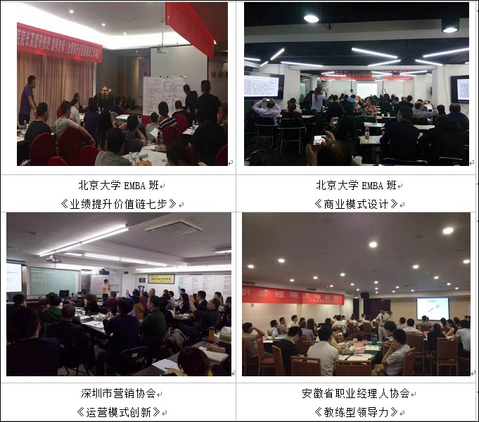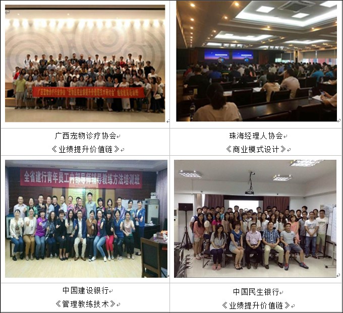 其中,廣東小白龍動漫文化股份有限公司連續(xù)6年返聘《企業(yè)轉(zhuǎn)型與戰(zhàn)略規(guī)劃》、《商業(yè)模式設(shè)計》、《運營模式設(shè)計》、《營銷模式創(chuàng)新》、《業(yè)績爆破——營銷關(guān)鍵價值鏈技術(shù)》、《價值倍增——新商業(yè)模式創(chuàng)新》、《賦能式教練領(lǐng)導(dǎo)力》、《管理教練技術(shù)》、課程培訓(xùn)及教練輔導(dǎo),好評率極高,并聘請老師為公司營銷總教練,助推企業(yè)連續(xù)6連取得年保持15%以上業(yè)績成長并掛牌新三板的佳績。