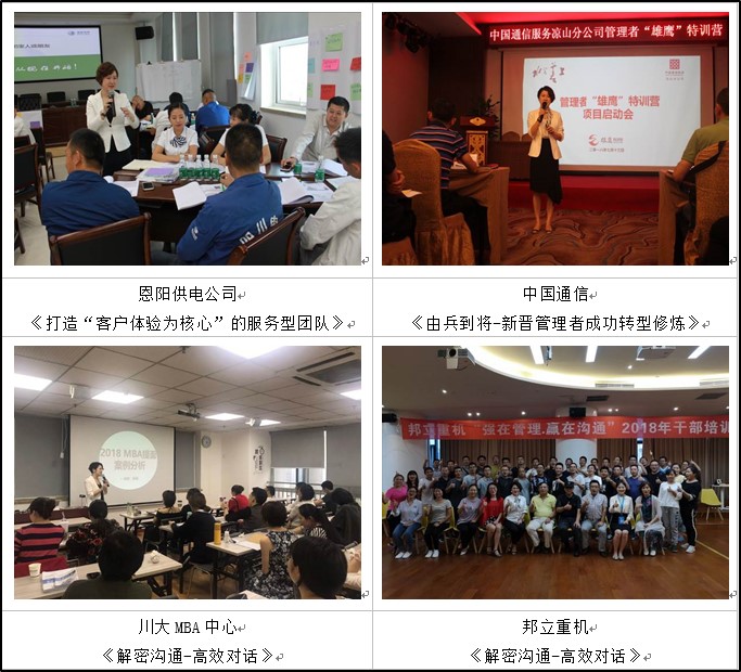 為通訊行業(yè)培養(yǎng)1000余名優(yōu)質(zhì)員工及管理者:多次應(yīng)邀為四川移動(dòng)、成都移動(dòng)、四川電信、成都電信、四川通信服務(wù)公司、涼山通信服務(wù)公司等進(jìn)行《習(xí)贏職場(chǎng)-高效能人士的七把金鑰匙》、《由兵到將-新晉管理者成功轉(zhuǎn)型修煉》、《新員工職業(yè)化和服務(wù)營(yíng)銷》等課程培訓(xùn),為通訊行業(yè)培養(yǎng)1000余名優(yōu)質(zhì)員工及管理者,客戶滿意度達(dá)94%以上。