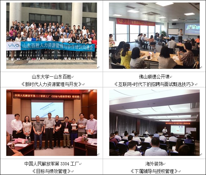 楊老師服務(wù)的客戶(hù)遍布北京、天津、上海、深圳、廣州、成都、南京、杭州、武漢、鄭州、沈陽(yáng)、哈爾濱、長(zhǎng)春、長(zhǎng)沙、西藏、蘭州、銀川、福州等地200以上企業(yè),為中核工業(yè)集團(tuán)、三星中國(guó)、中國(guó)移動(dòng)、中國(guó)電信、中國(guó)聯(lián)通、中鐵建工集團(tuán)、中國(guó)重汽、美的集團(tuán)、中國(guó)郵政、中國(guó)郵儲(chǔ)、中通通訊、中國(guó)建設(shè)銀行、中國(guó)工商銀行、中國(guó)農(nóng)業(yè)銀行、中信銀行、柳工集團(tuán)、陽(yáng)光保險(xiǎn)、華美集團(tuán)、中通通訊、惠豐機(jī)電、建滔化工集團(tuán)、金威啤酒集團(tuán)、富士康集團(tuán)、美的集團(tuán)、巴士集團(tuán)、重慶電工、遵義卷煙、共進(jìn)電子、廣州恒大集團(tuán)、廣州粒上皇食品、廣西路橋集團(tuán)、河南心連心化肥、南寧威寧投資集團(tuán)、南沙海城貨代、順豐快遞、廣東省各地人才交流中心、清華大學(xué)國(guó)際MBA教學(xué)中心、武漢大學(xué)干部培訓(xùn)中心、華中科技大學(xué)MBA教學(xué)中心、華東理工大學(xué)培訓(xùn)中心、蘭州大學(xué)研究生院、河北工業(yè)大學(xué)、廈門(mén)大學(xué)、上海交通大學(xué)、西南交通大學(xué)干部培訓(xùn)中心等多家高校EMBA班授課和多家大中型企事業(yè)單位進(jìn)行中、高層領(lǐng)導(dǎo)加力與管理技能、人力資源管理技能及職業(yè)素養(yǎng)提升、陽(yáng)光心態(tài)培訓(xùn)超700余場(chǎng)次。