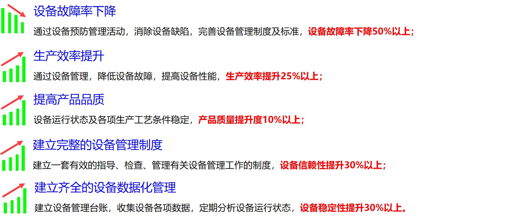 生產(chǎn)效率提升50%以上;產(chǎn)品質(zhì)量提升度30%以上;生產(chǎn)經(jīng)營成本下降10%以上;設(shè)備故障率下降70%以上---確保成為行業(yè)標桿和最高競爭力企業(yè)